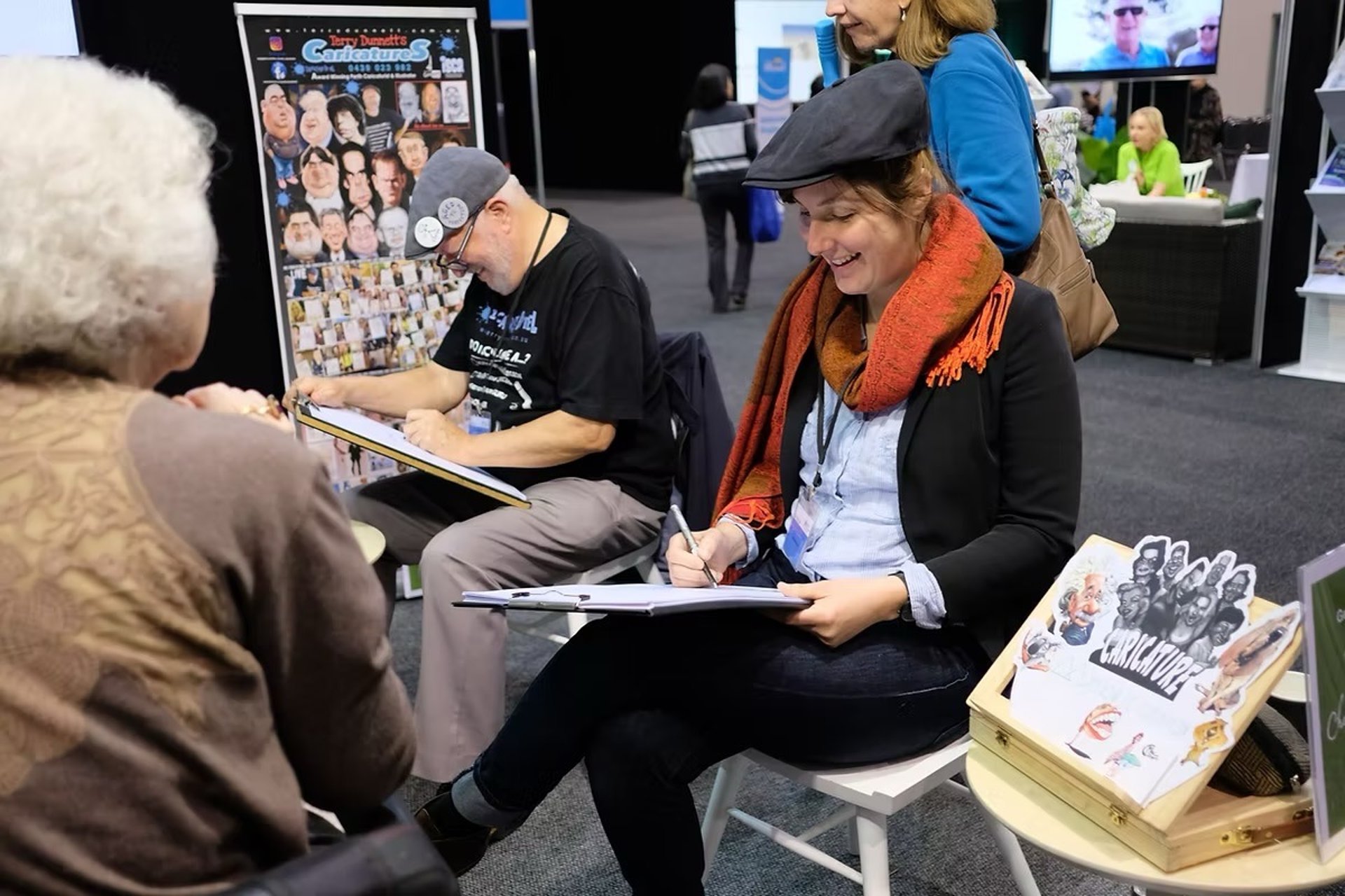 At Trade-Shows, caricature sketching is the ultimate attention grabber and will draw people into your booth all day long. A much better give-away than a pen or a sweet!